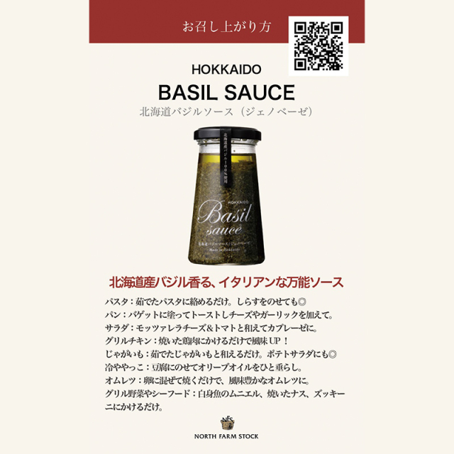 北海道の大地が育んだ香り高いバジルを贅沢に使用したこのソースは、シンプルながらも奥深い味わいで、さまざまな料理にアレンジが可能です。毎日の食卓を彩る一品として、ぜひお試しください。
