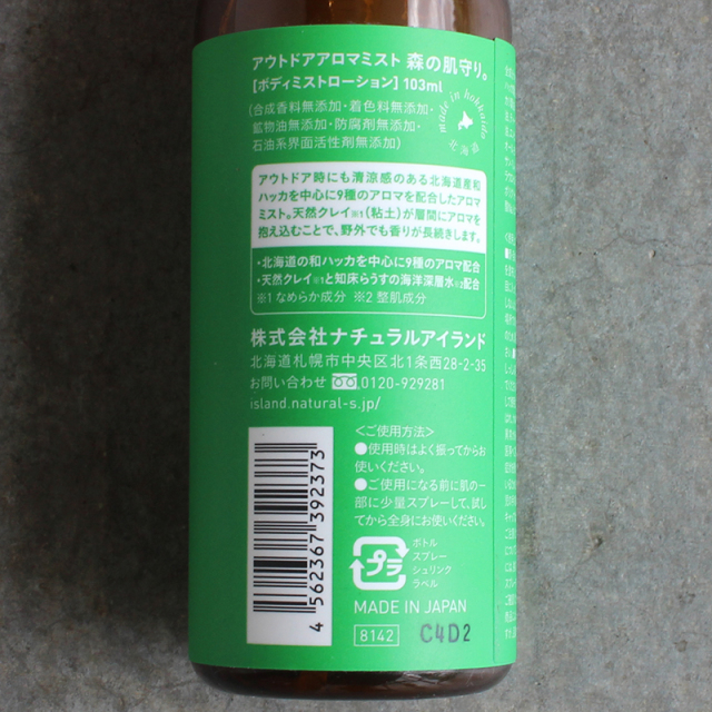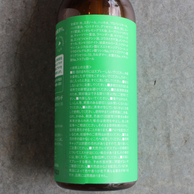 全成分●水、エタノール、ハッカ水、プロパンジオール、ハッカ葉油、ベントナイト、グリセリン、海水、BG、ユーカリ葉油、インドレモングラス油、ユーカリシトリオドラ油、ティーツリー葉油、ラベンダー油、セイヨウハッカ油、エンピツビャクシン油、コウスイガヤ油、メンタンジオール、モンモリロナイト、結晶セルロース、シクロヘキサン-1,4-ジカルボン酸ビスエトキシジグリコール、ジラウロイルグルタミン酸リシンNa、ジイソステアリン酸ポリグリセリル-10、カルボマー、水酸化Na、メタリン酸Na、トコフェロール